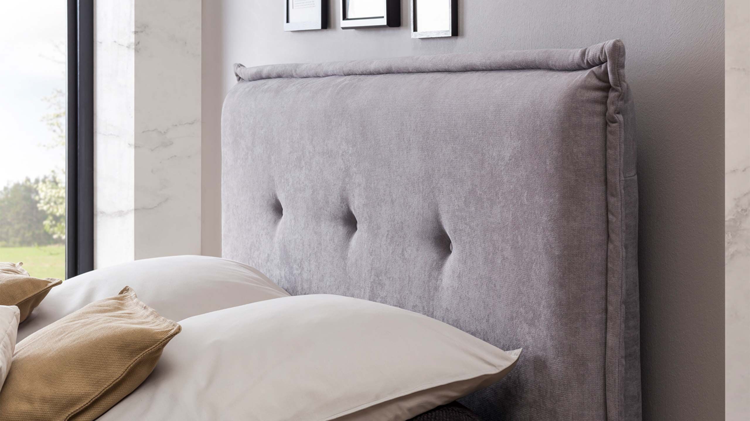 - Das aufgepolsterte Kopfteil mit verstärktem Randbereich und Knopfsteppung verleiht dem Bett eine zeitlose, moderne Optik.