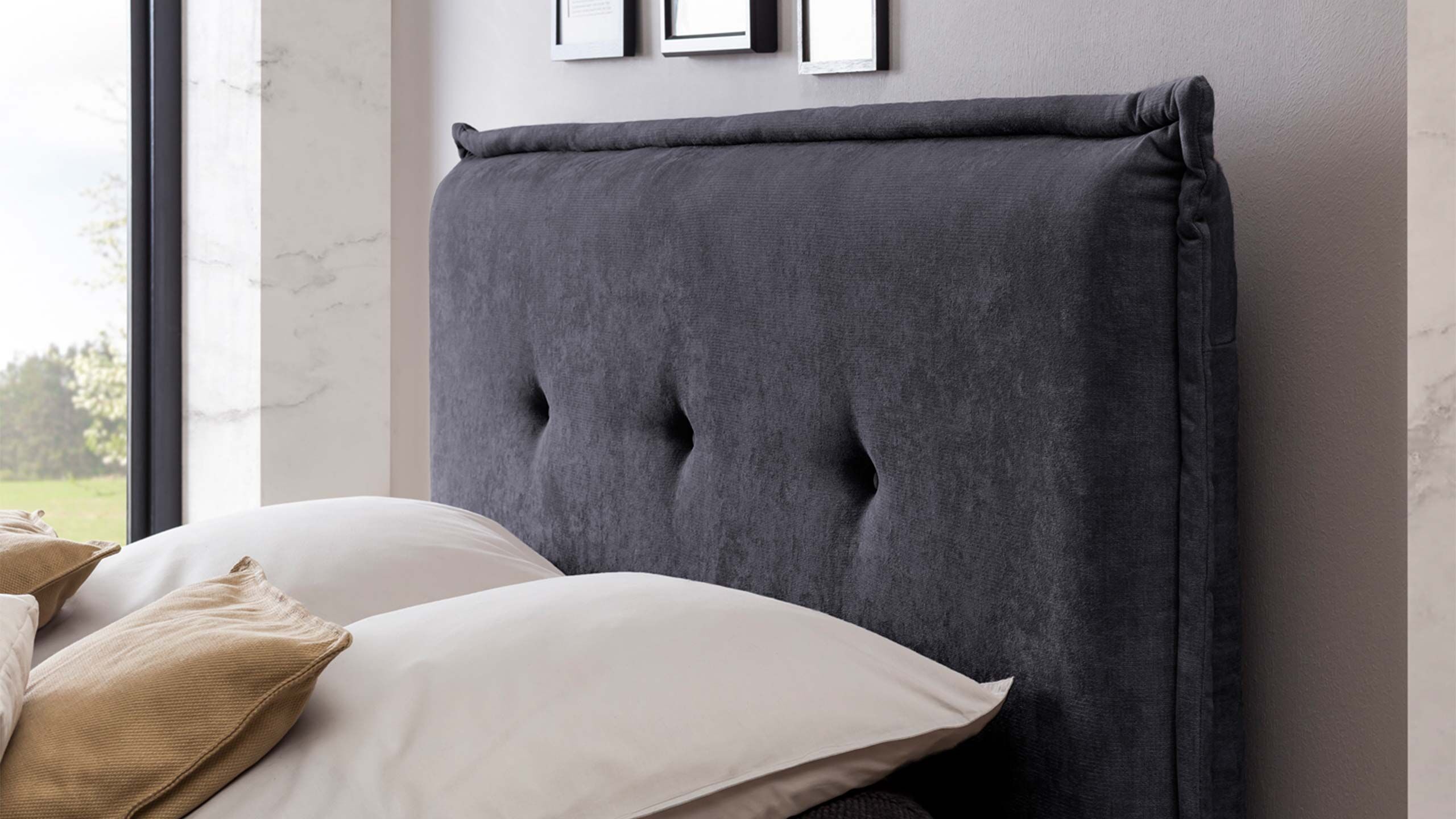 • Das aufgepolsterte Kopfteil mit verstärktem Randbereich und Knopfsteppung verleiht dem Bett eine zeitlose, moderne Optik.