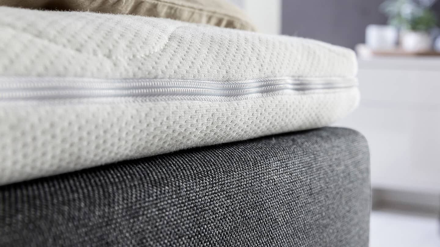 Das oberste Element des Schlafsystems bildet ein Topper, der die gesamte Breite des Bettes abdeckt. Bei Doppelbetten hat dies den zusätzlichen Vorteil einer einheitlichen, durchgehenden Liegefläche, ohne Unebenheiten.
