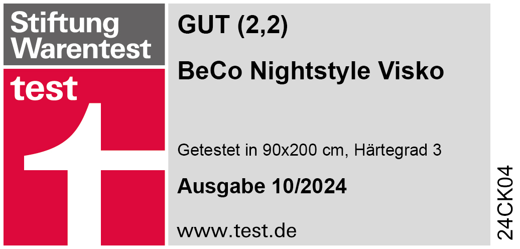 Die in Deutschland hergestellte Matratze wurde von der Stiftung Warentest in der Ausgabe 9/2024 mit der Note „GUT“ (2,2) und als die beste getestete Visko-Matratze bis 200 Euro (Ausgabe 10/2024, neu getestet in 90x200 cm, Härtegrad H3) ausgezeichnet.