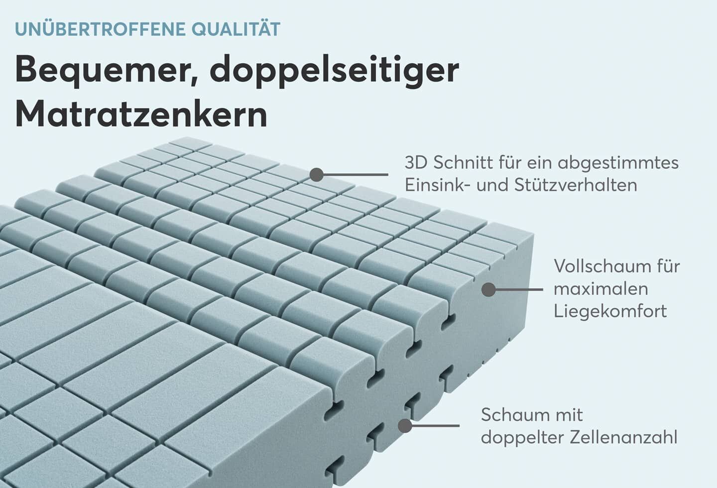 Der Matratzenkern der Komfort-MED Matratze ist das Geheimnis ihres herausragenden Komforts. Dank des Konturenschnitts bietet sie eine punktoptimale Schulter- und Beckenabsenkung, eine komfortable Mittelzone und leistungsfähige Lordosenstütze, um deine ergnomische Schlaflage in jeder Nacht zu ermöglichen. Die Matratze verfügt über einen Hybridschaumkern, der für besseren Liegekomfort sorgt. Dieser Kern mit 3-D-Schnitttechnik besteht aus einem Vollschaum mit Konturenschnitt und bietet maximale Druckverteilung sowie optimale Unterstützung. Dank des innovativen Schaums mit doppelter Zellanzahl ist die Matratze leicht und dennoch leistungsfähig. Mit einer geringen Stauchhärte und hoher Materialdichte bietet sie dabei einen hervorragendes Preis-Leistungsverhältnis.