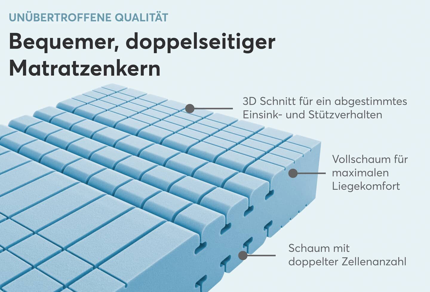 Der Matratzenkern der Komfort-MED Matratze ist das Geheimnis ihres herausragenden Komforts. Dank des Konturenschnitts bietet sie eine punktoptimale Schulter- und Beckenabsenkung, eine komfortable Mittelzone und leistungsfähige Lordosenstütze, um deine ergnomische Schlaflage in jeder Nacht zu ermöglichen. Die Matratze verfügt über einen Hybridschaumkern, der für besseren Liegekomfort sorgt. Dieser Kern mit 3-D-Schnitttechnik besteht aus einem Vollschaum mit Konturenschnitt und bietet maximale Druckverteilung sowie optimale Unterstützung. Dank des innovativen Schaums mit doppelter Zellanzahl ist die Matratze leicht und dennoch leistungsfähig. Mit einer geringen Stauchhärte und hoher Materialdichte bietet sie dabei einen hervorragendes Preis-Leistungsverhältnis.