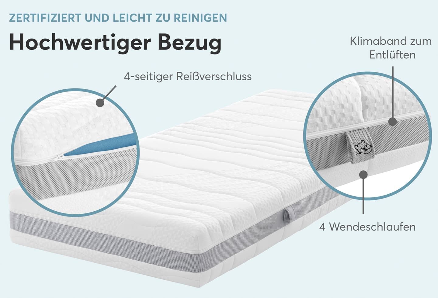 Mit einem klimaoptimierten Doppeltuch-Bezug und einem 7 cm Klimaband für bessere Be- und Entlüftung bietet er die ideale Ergänzung zum Matratzenkern. Zusätzlich verfügt der Bezug über vier Wendeschlaufen aus Klimaband mit dem Ravensbärchen Logo. Der Bezug verfügt über einen umlaufenden 4-Seiten Reißverschluss, um ihn auch hälftig zu Hause waschen zu können. Unser atmungsaktiver PES-Bezug ist bis zu 60°C waschbar und ein wichtiger Bestandteil dieses Klimasystems.