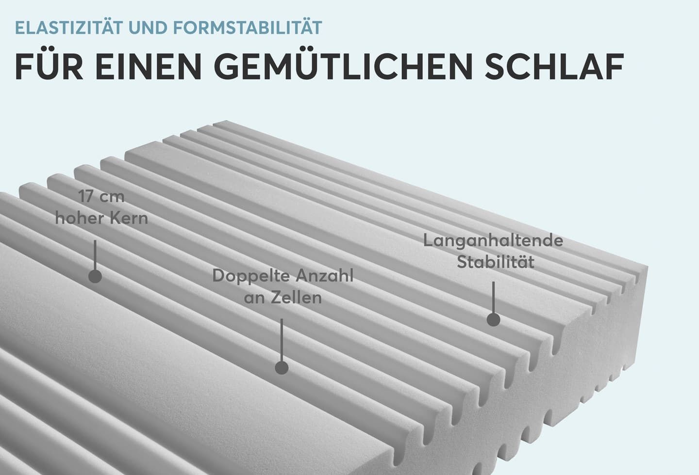 • Hohe Elastizität und Haltbarkeit durch doppelte Zellanzahl im Vergleich zu herkömmlichen Matratzenkernen