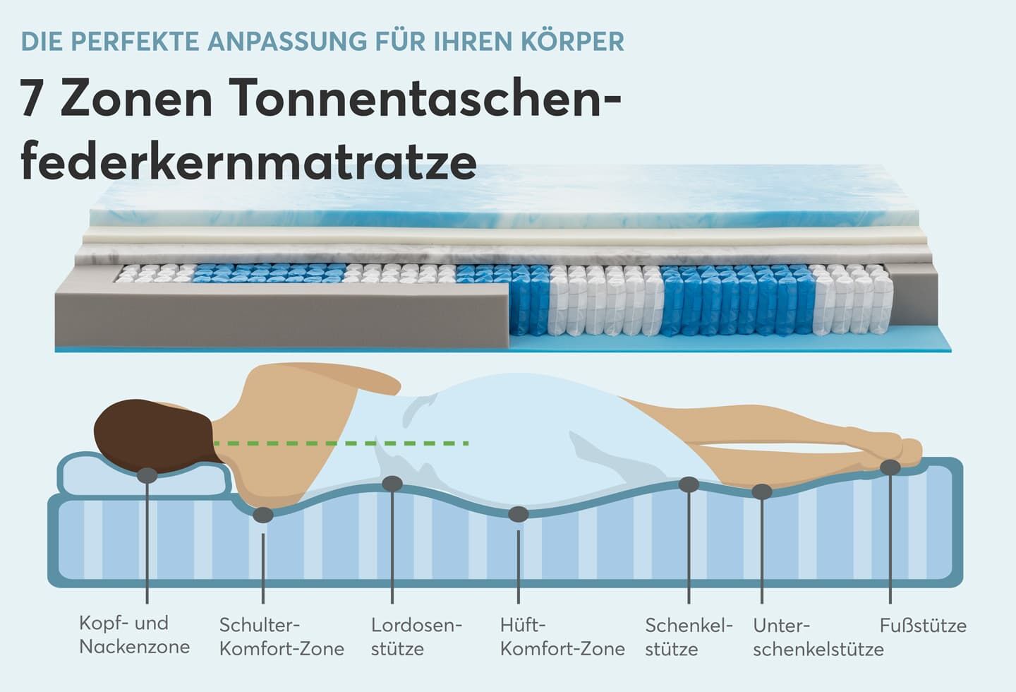 | Zonen: | 7-Zonen-Körperanpassung - Punktelastizität und gute Stützkraft | |