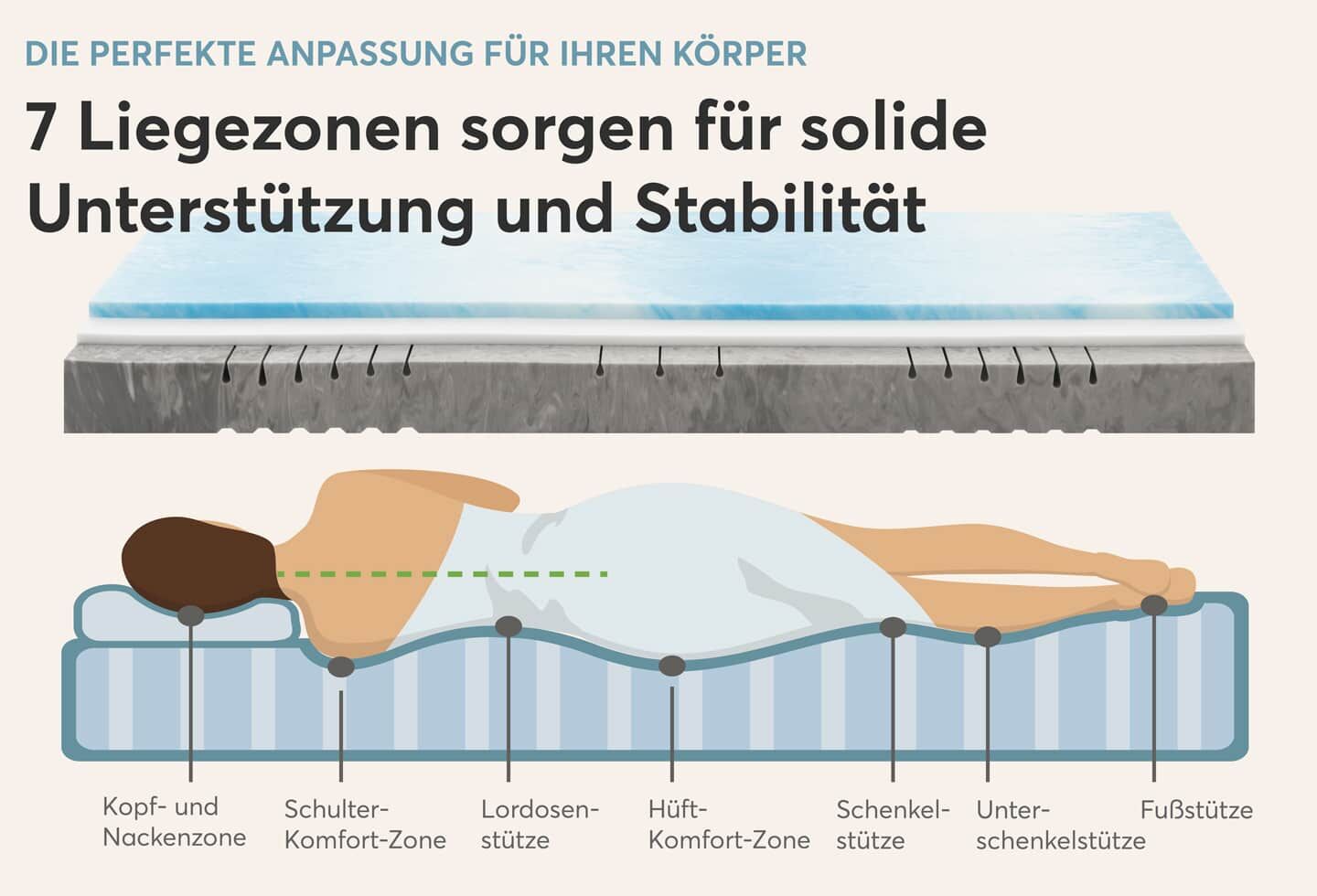 | Zonen: | 7-Zonen-Körperanpassung - Punktelastizität und gute Stützkraft | |