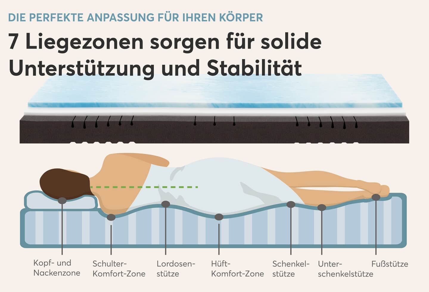 | Zonen: | 7-Zonen-Körperanpassung - Punktelastizität und gute Stützkraft | |