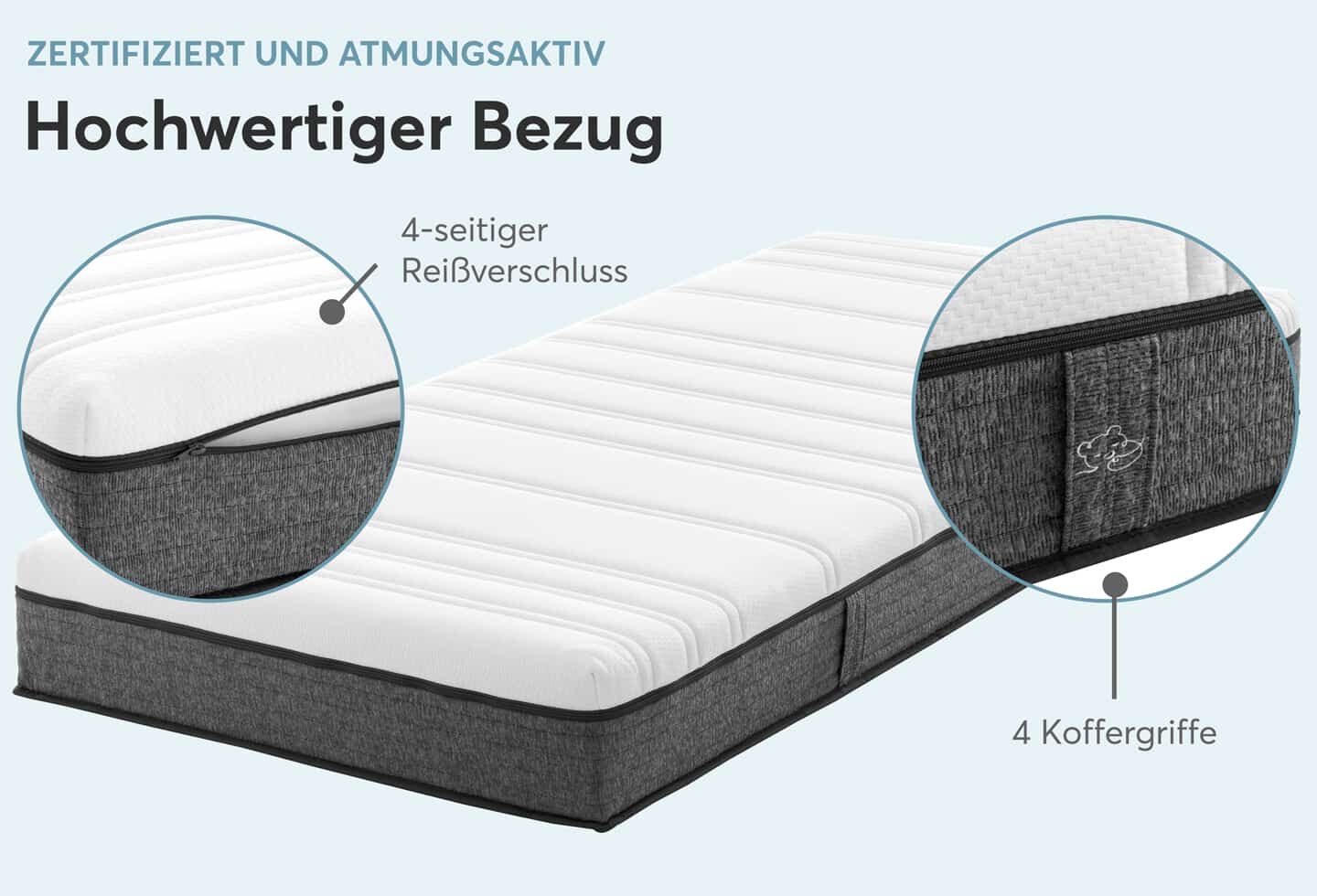 Der Bezug ist mit einem 4-seitigen Reißverschluss ausgestattet, der ein einfaches Teilen und separates Waschen ermöglicht. Mit einer Waschtemperatur von bis zu 60 °C ist der Bezug leicht zu reinigen. Zusätzlich verfügt er über vier Koffergriffe aus robustem Borderstoff für eine sichere Handhabung und einfaches Aufziehen auf die Matratze.