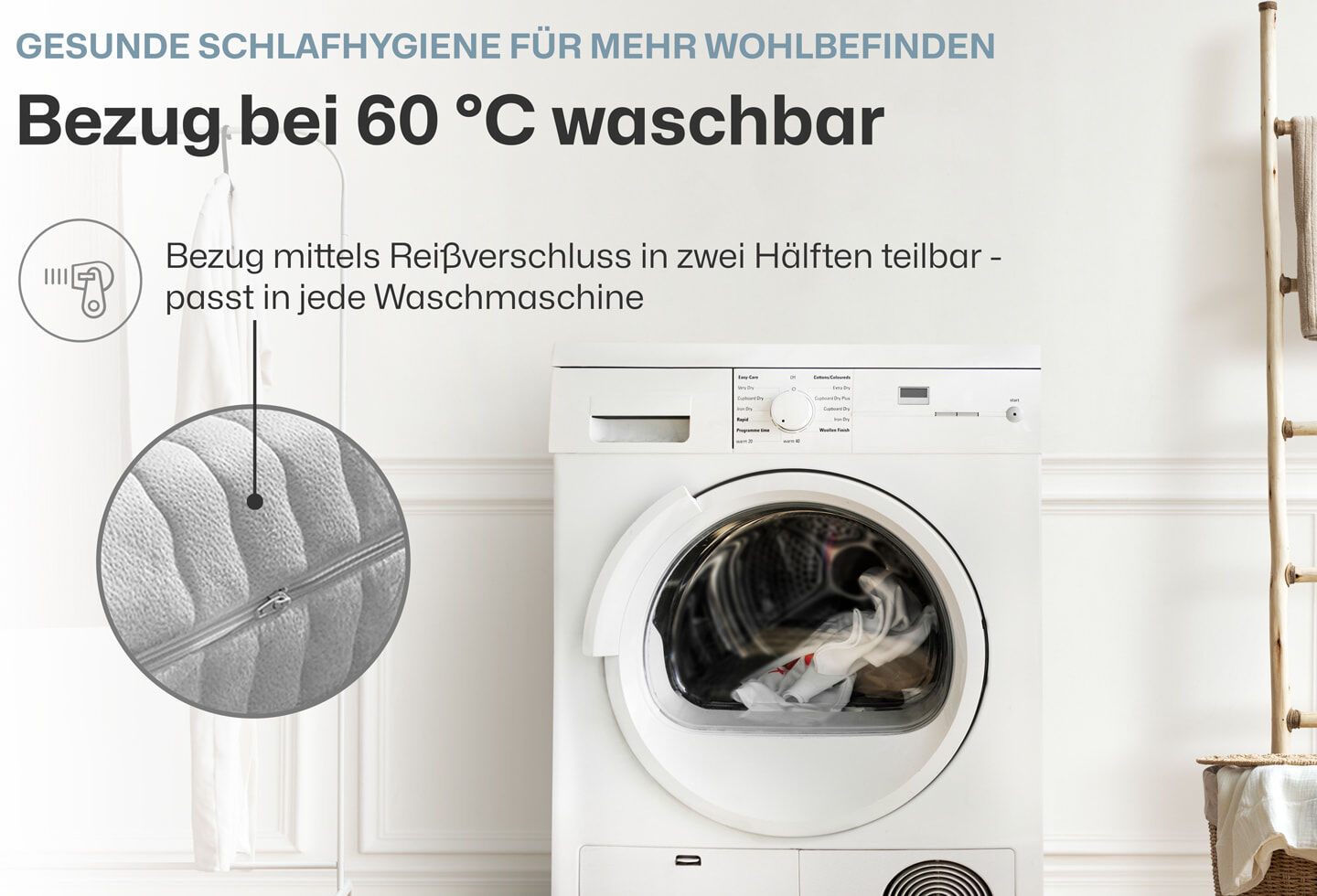 Unsere hochwertigen Bezüge – waschbar bis 60° – sind mit ihrer Feuchtigkeitsaufnahme von bis zu 40% ein wichtiger Bestandteil dieses Klimasystems und wesentlicher Teil der Hygieneausstattung.