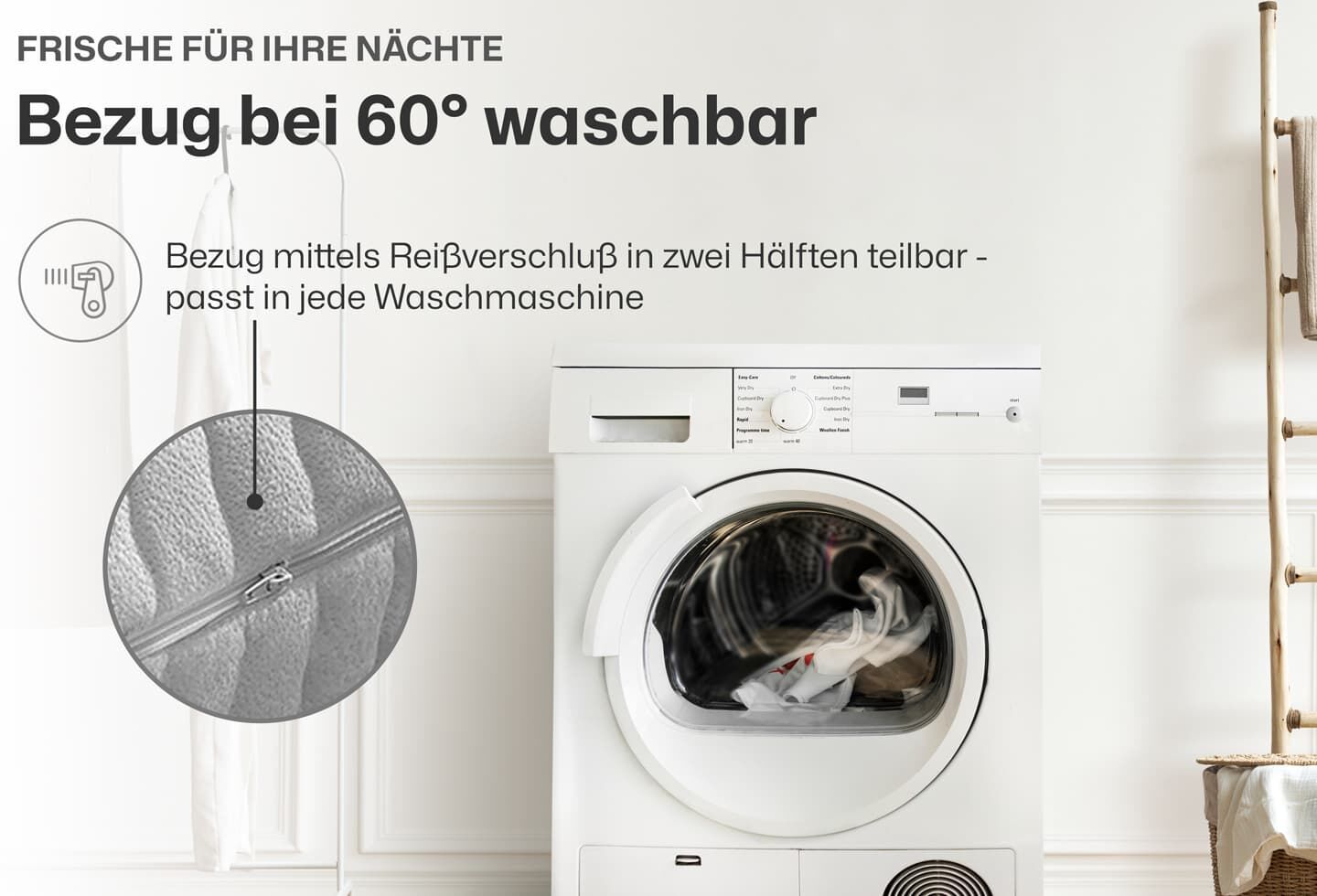Der Baumwoll-Doppeltuch-Bezug ist mit seiner Feuchtigkeitsaufnahme von bis zu 40% ein wichtiger Bestandteil dieses Klimasystems und wesentlicher Bestandteil der Hygieneausstattung. Der Bezug ist optimal temperaturausgleichend und feuchtigkeitsregulierend. Alle Bezüge verfügen über 4 Wendeschlaufen und einen umlaufenden 4-Seiten Reißverschluss. Dadurch sind die Bezüge hälftig trennbar und können zu Hause bis zu 60°C gewaschen werden.