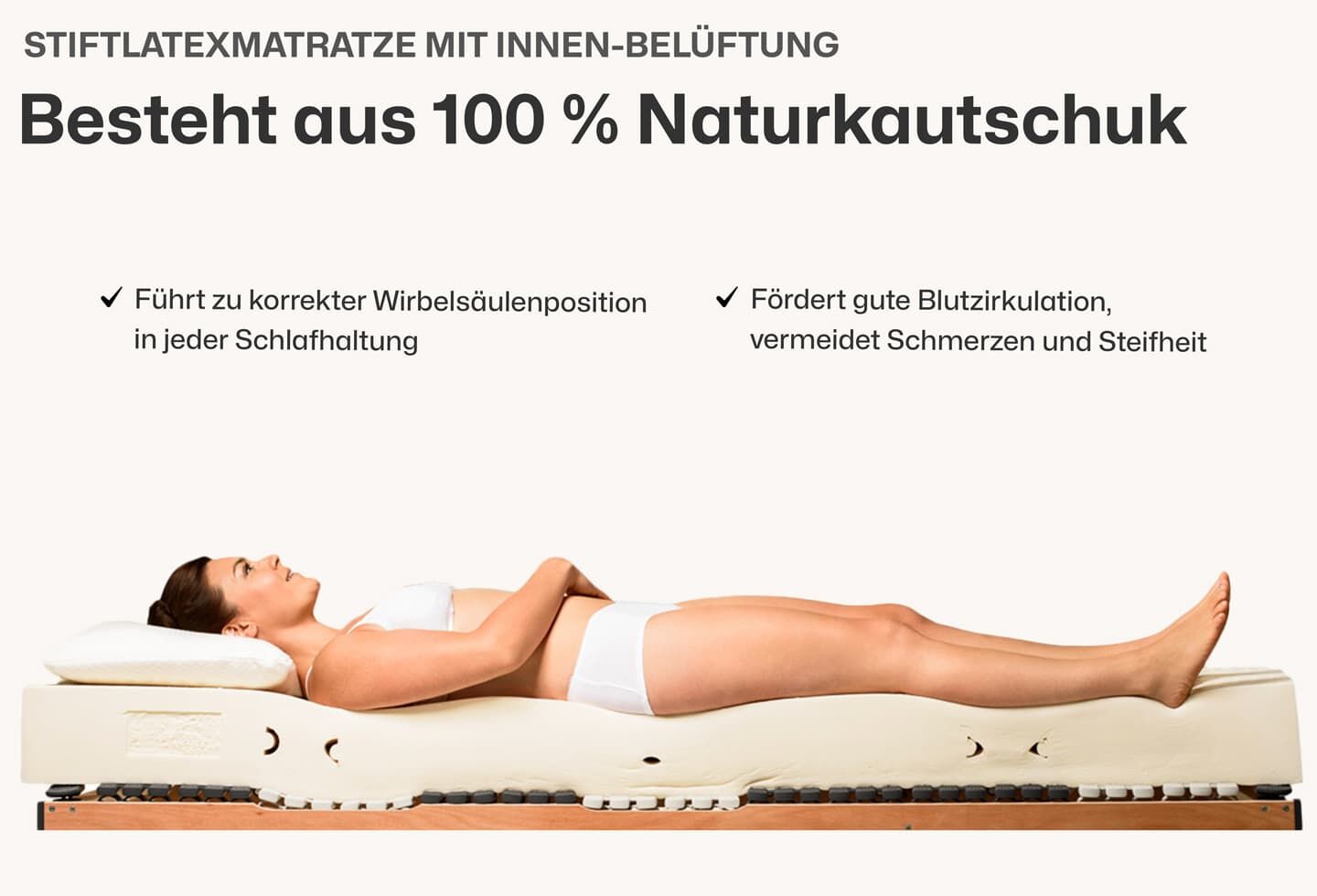 Die Natürlichkeit des hochwertigen Stiftlatex aus 100% NATUR-Latex führt zur punktoptimalen natürlichen Körperanpassung, der ergonomisch gesunden Schlafhaltung in jeder Lage und zu höchster Schlafruhe.