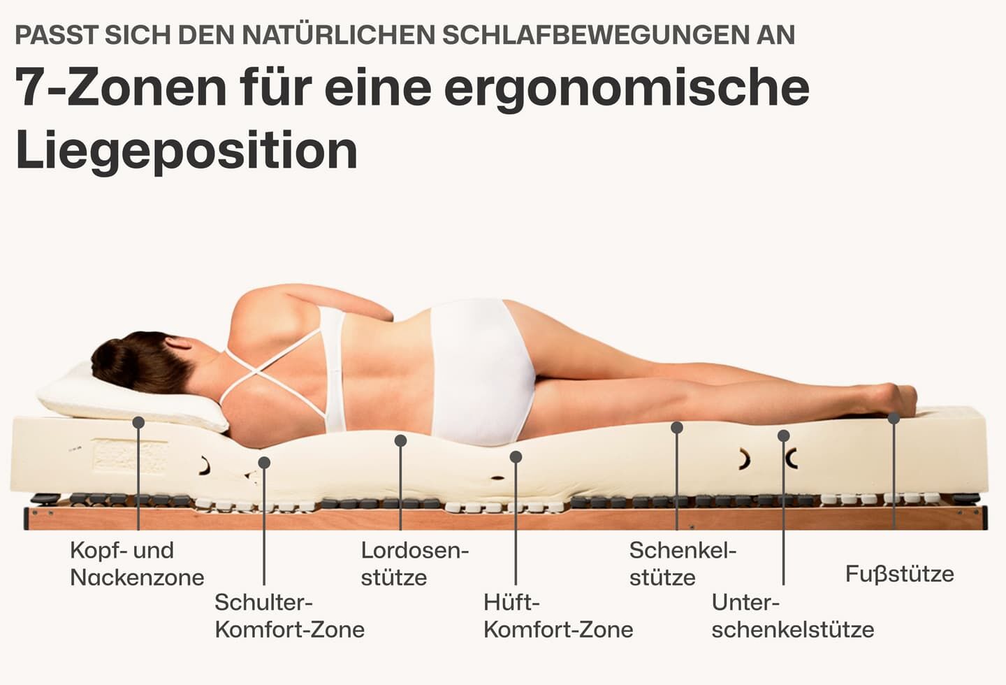 - Gute Druckentlastung und mit unterstützender Schulter- und Beckenkomfortzone sowie Lordosenstütze