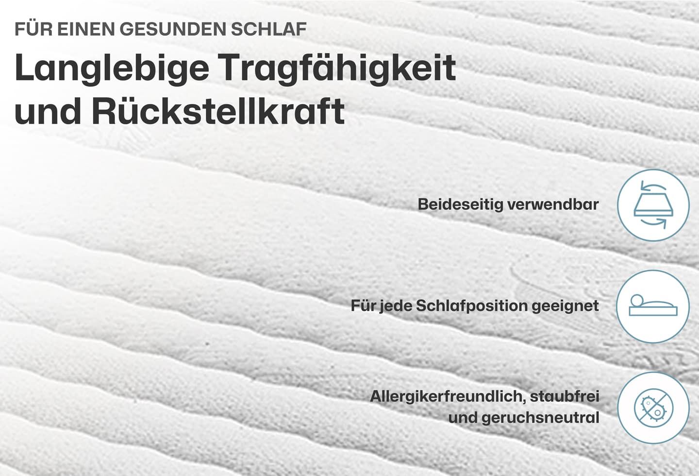 | Zonen: | Natürliche 7-Zonen-Körperanpasssung - Optimaler natürlicher Liegekomfort und ideale Schlafruhe | |
